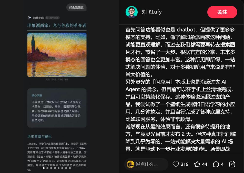 自上周二上线以来,灵光已在用户端迅速积累起不少口碑。许多用户在社交平台上分享他们的第一手体验,从速度、易用性、效果到产品理念,都给出了不少真实反馈。