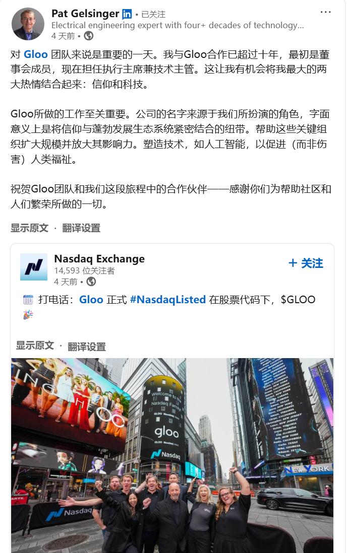 为了做好这个产品,他们还邀请了前英特尔CEO Pat Gelsinger出任了Gloo技术主管兼执行主席,主导虚拟助手与信仰对齐大模型开发。
