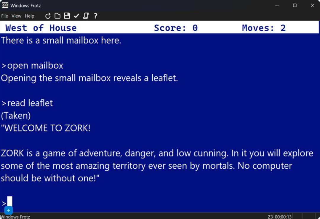 然后在 Z-Machine 运行器中运行 Z3 文件。微软官方给示例中,使用的是 David Kinder 基于 Stefan Jokisch Frotz 核心开发的 Windows Frotz: