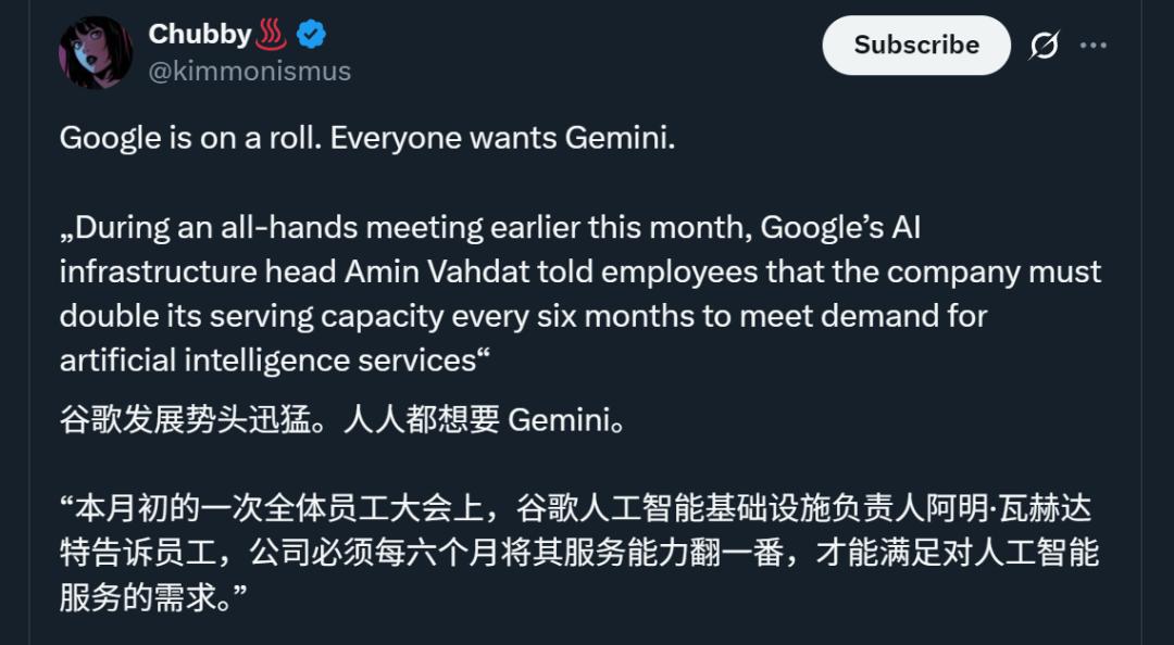 而且谷歌内部已经清楚,“公司必须每六个月将其服务能力翻一番,才能满足对AI服务的需求”。