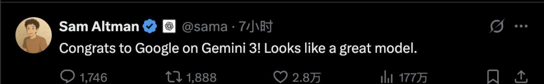 而面对这一情形,奥特曼也少见地出面为竞争对手谷歌送上祝福: