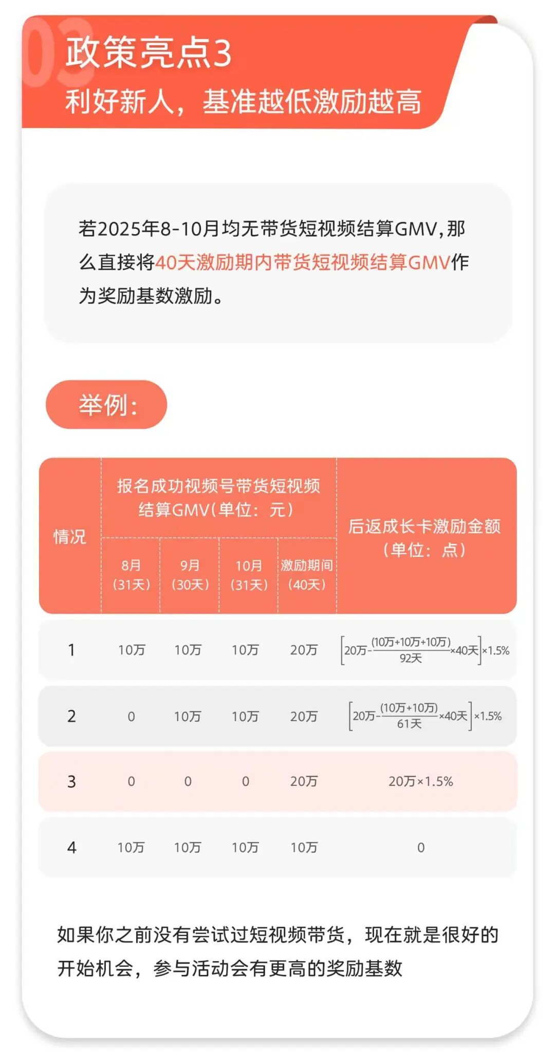 二是电商成长卡奖励。只要带货短视频产生订单并成功结算,平台就会按“增量结算GMV”给你成长卡点数,比例是奖励基数×1.5%,单个视频号账号最多可拿15万点成长卡流量激励。