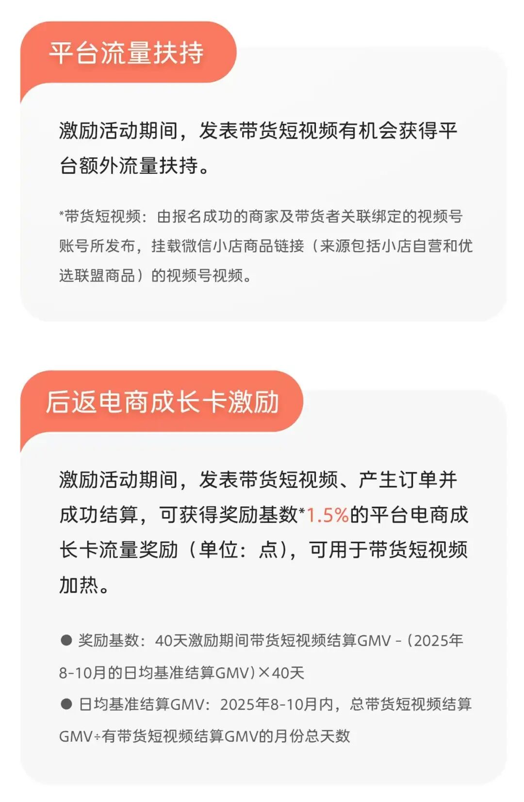 这次激励计划几乎没有额外门槛,不看店铺评分或等级,核心条件只有一个:视频号账号开通短视频带货功能,并且从“按增量返还”的奖励设计看,越是新入场、增长越快的商家,越容易拿到更高奖励。