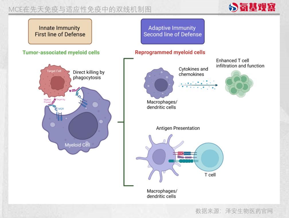 以泽安生物的MCE为例,在肿瘤治疗上,MCE可以直接激活吞噬作用和ADCC杀死癌细胞,还能增强吞噬和抗原呈递功能,促进炎症细胞因子的释放,进一步募集和激活T细胞、NK细胞等,并将吞噬后的肿瘤新抗原呈递给T细胞。