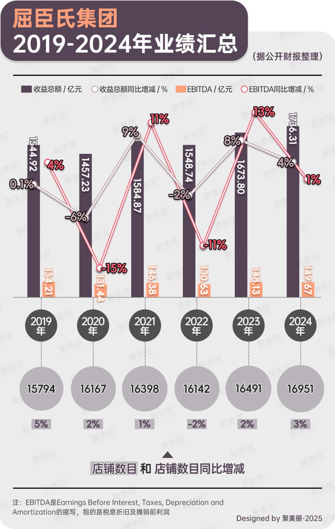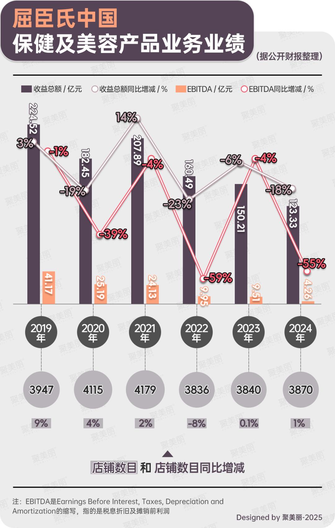 从财报来看,屈臣氏集团在全球及中国市场的表现均不尽如人意。从下图来看,屈臣氏集团虽在2024年创下店铺数量高峰,但仍难掩颓势——收益额、EBITDA(税息折旧及摊销前利润)双双增速放缓,且在2019-2024年期间还出现多次业绩下滑。