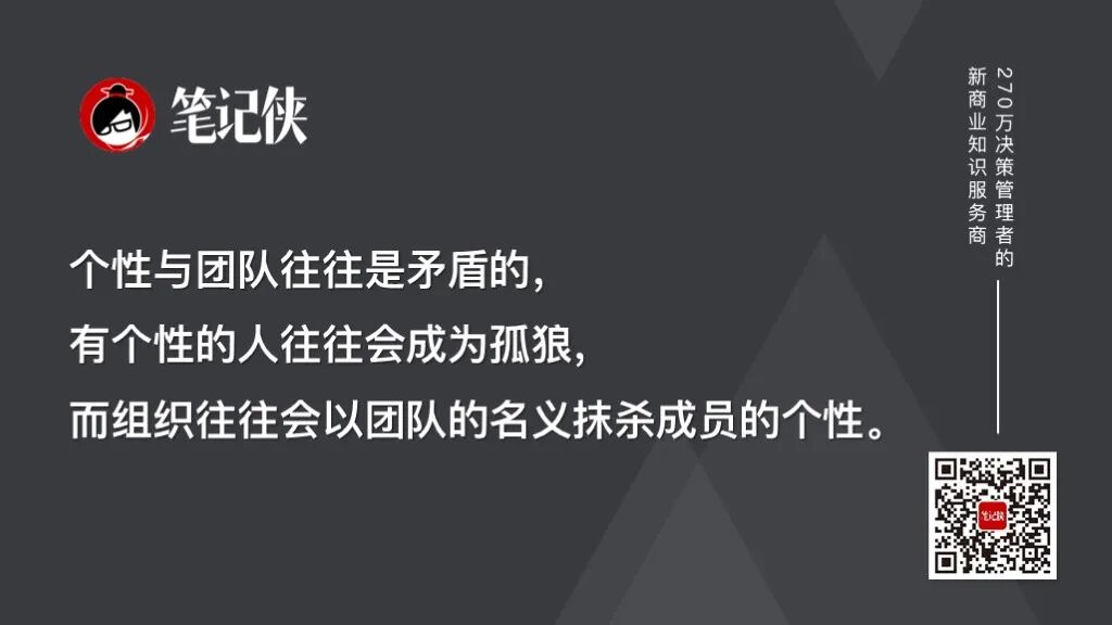 个性与团队往往是矛盾的,有个性的人往往会成为孤狼,而组织往往会以团队的名义抹杀成员的个性。