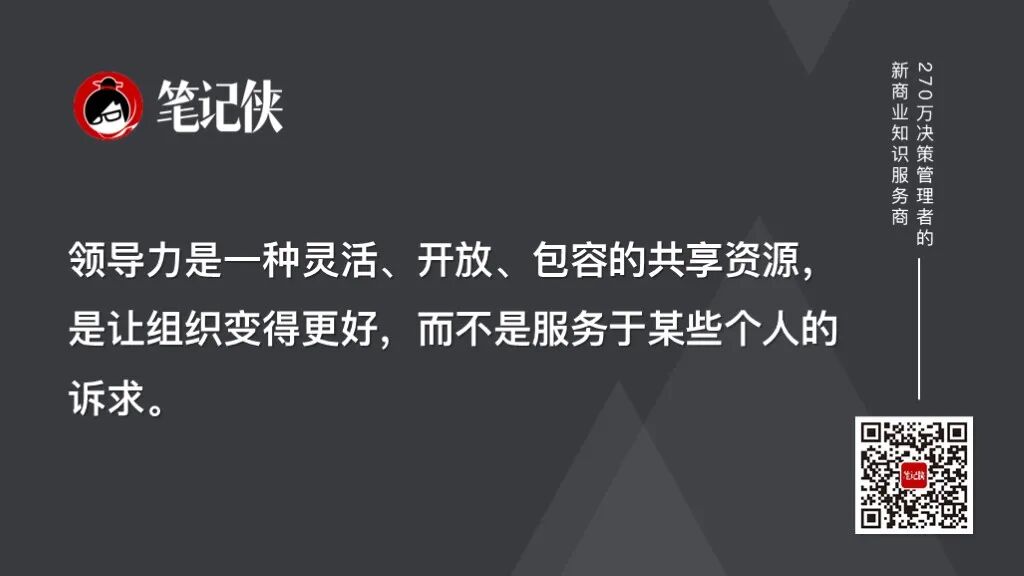 领导力是大家共享的一种灵活、开放、包容的资源,它运用的目的是让组织变得更好,而不是服务于某些个人的诉求。