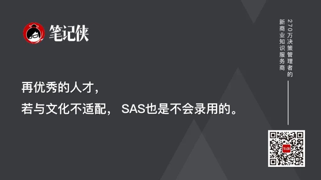 书里还有一句话:“我们这个时代动不动就用结构化的面试、猎头评估、心理测评来选人。但SAS凭着一杯酒的对话,就能判断你是不是我们的人。”