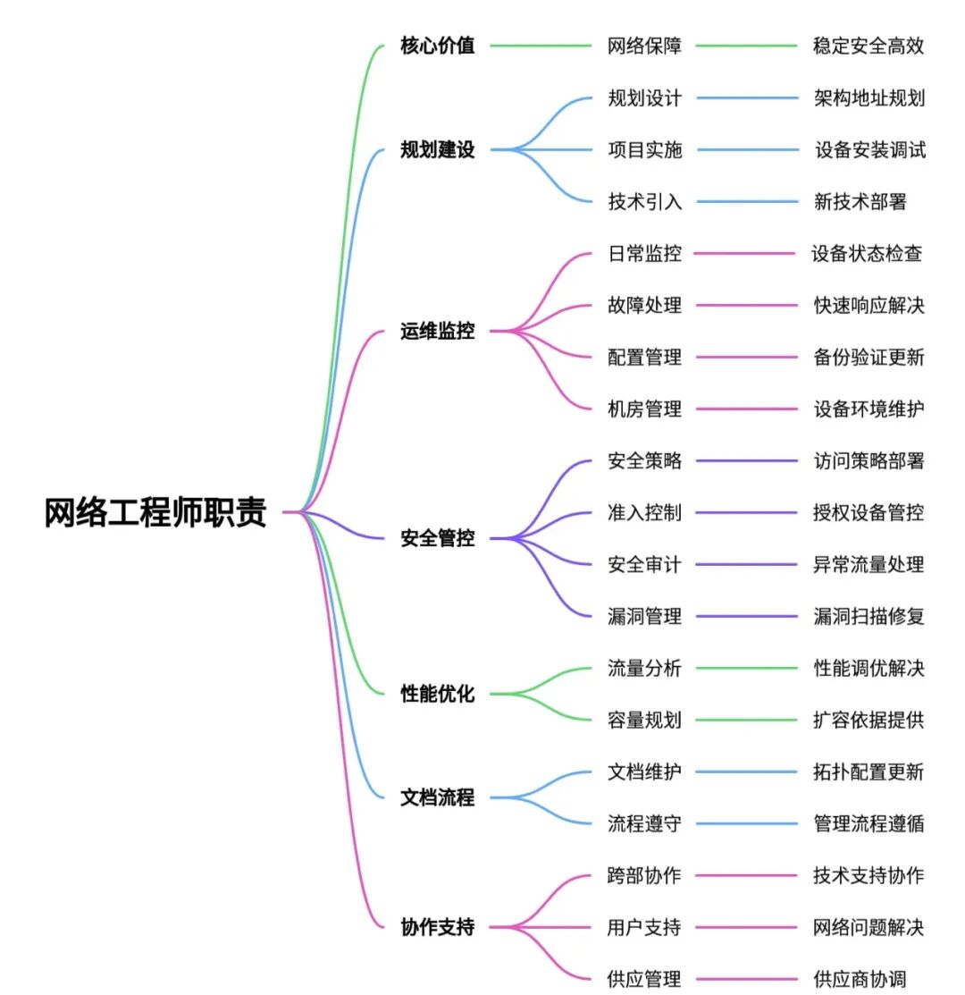 以上职责清单可以作为企业招聘、绩效考核和岗位培训的基准。最后总结一下网络工程师的职责核心是通过专业、规范、主动的运维管理,构建一个高可用、高安全、易扩展的网络环境,从而无声地支撑企业所有数字化业务的顺畅运行。