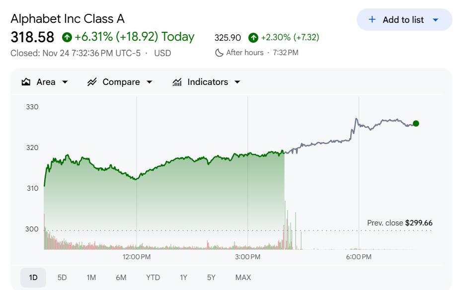 今日,Alphabet(GOOGL)股价再度上演“加速跑”行情,盘中涨幅一度超过 6%,盘后报价继续上扬,强劲站上 320美元上方。目前公司的总市值正强力剑指4万亿美元大关。