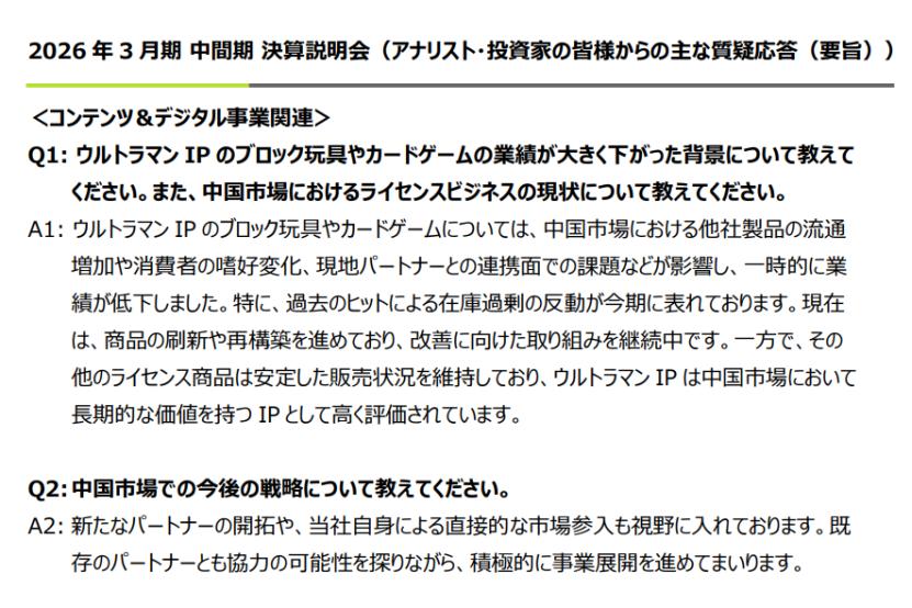 圆谷在中国市场的情况则呈现出更为复杂的局面。上半财年,奥特曼IP在中国市场的授权业务收入同比出现显著下滑,降幅达44.2%。这一短期波动主要源于积木玩具和卡牌等核心品类的库存积压问题。圆谷在业绩说明会中坦言:“中国市场上其他同类产品的销量增加、消费者偏好发生变化,以及与当地合作伙伴的合作中存在诸多问题。尤其是,过去的热销导致库存积压,其负面影响在本期显现出来。”这一情况,与卡游、布鲁可等主要合作伙伴的销售调整密切相关。