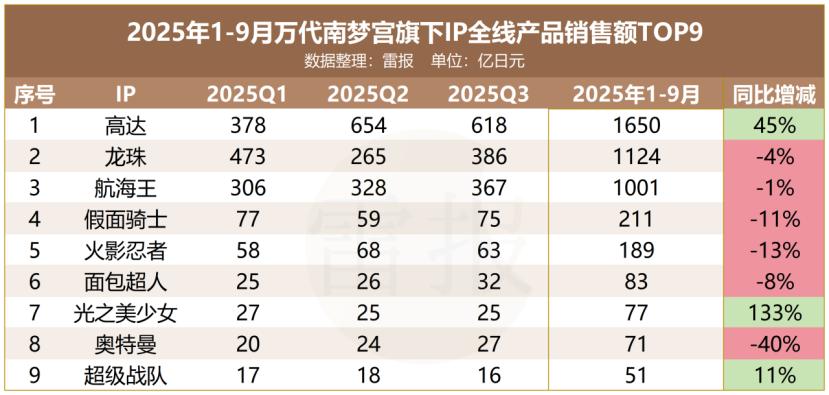 《高达》IP(+66.3%)与三丽鸥家族(+39.5%)的爆发式增长,与《龙珠》IP(-14%)、《航海王》IP(-5.1%)等老牌IP的原地踏步形成鲜明对比。同为头部IP,增长路径与下滑原因却大相径庭,这深刻反映了不同IP的运营策略与内容周期差异。