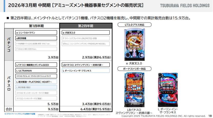 圆谷的惊人增长,则主要归功于其娱乐设备业务(如弹珠机、老虎机)的爆炸式表现,该业务板块销量同比增长228.6%至878.2亿日元,占同期圆谷集团总收入的91.5%,显示出将热门IP与本土化娱乐业态深度结合的变现潜力。不过,圆谷此次表现最亮眼的游艺设施产品是《新世纪福音战士~约定的大门~》,故而在本次统计中,雷报并未将圆谷总收入粗略计算为《奥特曼》IP的收入。