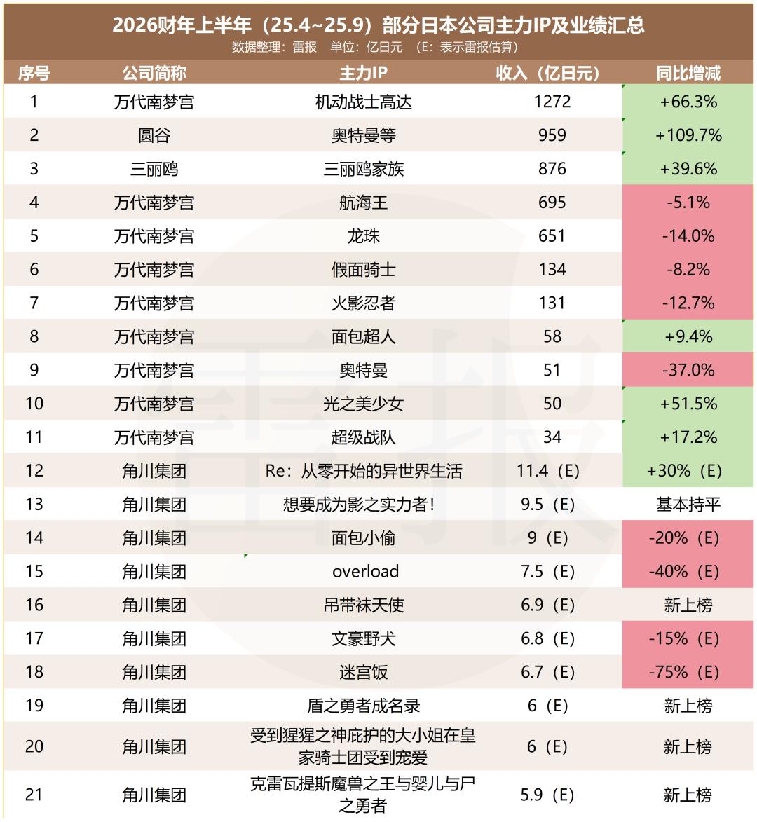 据此,我们不禁要追问:在这些热闹的线上表现背后,掌控着顶流IP的日本内容巨头们,在刚刚过去的上半财年(具体时间为2025年4月-9月)里,究竟收获如何?哪些IP是贡献收入的“压舱石”,哪些又是增长迅猛的“新引擎”?