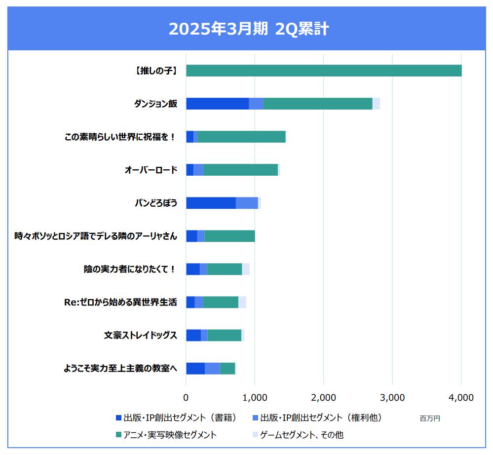 角川集团的IP生态则呈现出与万代、三丽鸥等衍生品驱动的公司截然不同的图景,角川的IP价值与动画内容周期的绑定更为紧密,波动性也更为显著。对比2025财年上半年(2024年4月至9月)与2026财年上半年(2025年4月至9月)的IP收入榜单,这种依赖症暴露无遗:上一财年凭借动画热潮,半年狂揽40亿日元的《我推的孩子》,在本财年已从榜单上消失;同样,《为美好的世界献上祝福!》等IP也因动画热度衰减而迅速淡出。