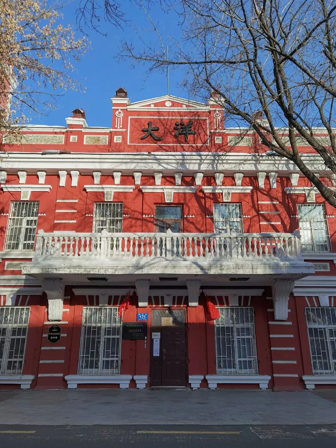 体育馆高耸的钟楼与微蓝的天空,碰撞出清透雅致的调调。 黑河商会,是一栋中西合璧式古早建筑,西式雕花配以中国式飞檐,彷佛看见了昔日“万国商埠”的风采。 而商会内院,“天赐百福”的牌匾,传递着传统的中国式愿景。