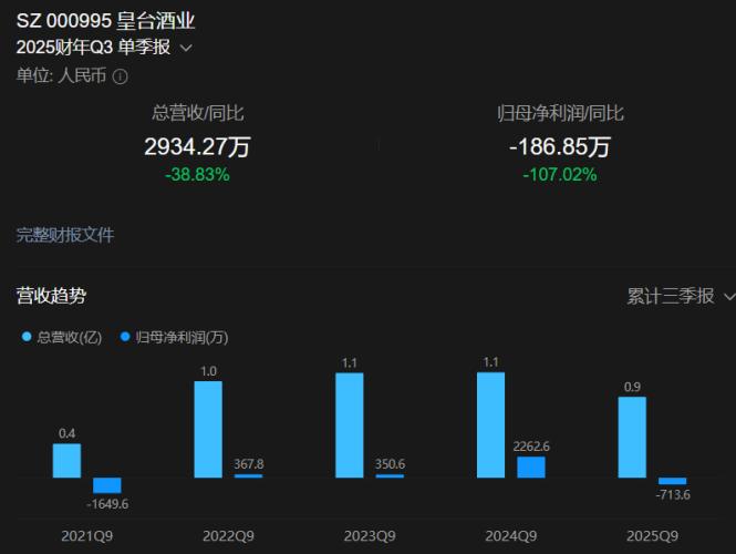 财报数据显示,今年Q3,皇台酒业营业收入为8708.31万元,同比下降23.25%;归母净利润为-713.59万元,同比下降131.54%;扣非归母净利润为-792.18万元,同比下降355.28%;基本每股收益-0.04元。归母净利润直接由盈转亏。