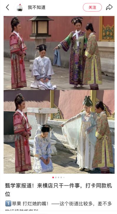 《甄嬛传》的主拍摄地明清宫苑,可以说是横店影视城最受欢迎的园区之一,剧集开播十二周年之际,翊坤宫俨然变身“娘娘茶话会”,游客们穿着吉服接“华妃”白眼,再体验“一丈红”互动,重现瓜尔佳氏雨天哭着求见皇后等经典桥段,不管你是i人还是e人,都可以在这个“嬛球影城”里找到属于自己的乐趣。