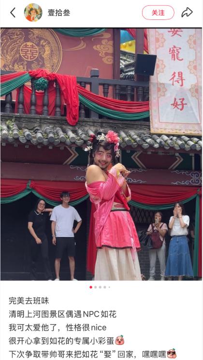 游客不仅可以欣赏《汴梁一梦》这样的经典演艺,更能与精心设计的NPC深度互动。其中以“如花”为首的NPC已经成为景区内现象级文化符号,吸引大量游客驻足交流、拍照留念,形成生动有趣的现场互动场景。更重要的是,游客能通过诗词对答、任务挑战等富有文化内涵的互动环节赚取“片酬”,最终兑换纪念礼品。