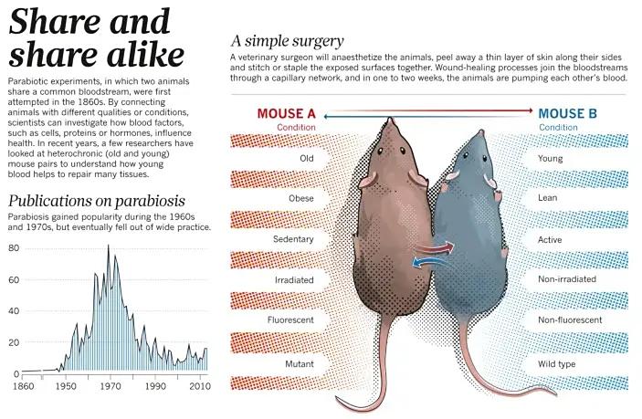 2005年,加州大学伯克利分校的康博伊夫妇进行了一项著名的“帕拉贝奥西斯实验”(Parabiosis),即把年轻的小鼠和年老小鼠用血管外科手术连接,使两只鼠共享一个血液系统。结果发现,年长老鼠变得更加年轻,其肌肉再生能力提升,肝脏老化减缓。