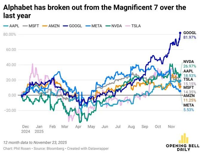 近来,投资者对谷歌最新的AI大厦模型Gemini 3、即将推出的第七代张量处理单元(TPU)、在AI图像生成平台Nano Banana Pro方面的进展,以及名为“Google Antigravity”的新智能体平台,都做出了积极反应。