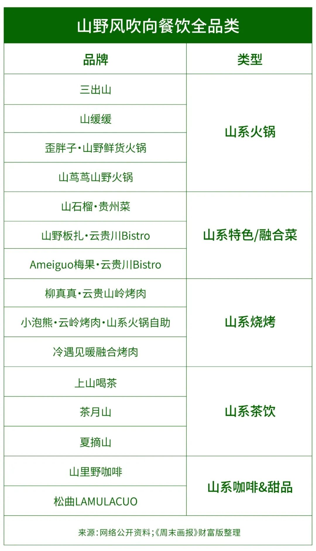 类似的品牌叙事还出现在餐饮行业。从山石榴贵州菜、山缓缓火锅,到各种云贵川Bistro,再到山野茶馆、山野咖啡,“山野风”向新餐饮各个品类渗透。它们或是在店内装潢与营销上打造出置身山林的感觉,或是主打新鲜自然的山野食材。