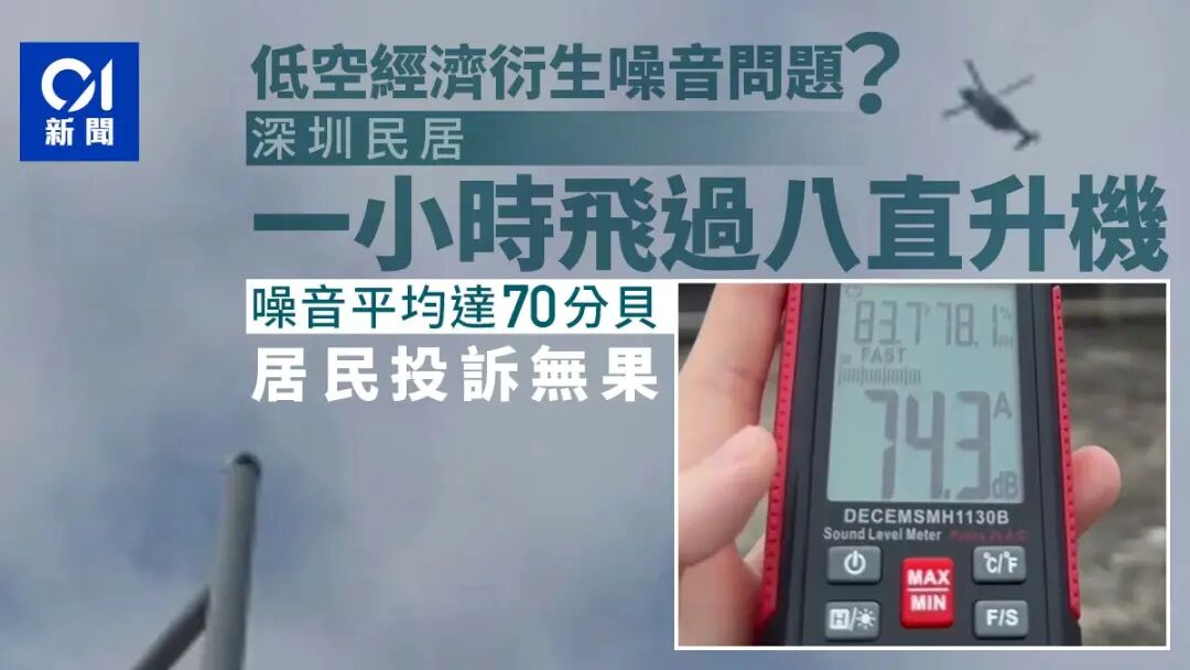 近年来,深圳出现多起向媒体反映的“噪音吵扰”事件,直升机及低空飞行器频繁低空经过住宅区,带来了显著的噪音干扰。有媒体在某位居民所在的住宅楼,用分贝仪测得,当飞行器经过时,分贝一度接近 70 dB,并在一小时内记录了多次穿越。该居民坦言,飞行声波强烈且不规律,仿佛“空中交通高峰期压在楼顶”,对孩子的休息和家庭生活造成持续影响。