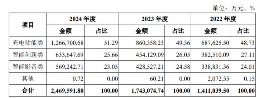 根据安克创新2025年6月公告的《向不特定对象发行可转换公司债券募集说明书》(简称:可转债募集说明书),公司的主营业务收入中,充电储能类占比最高,2024年为51.29%,智能创新类占比为25.66%,智能影音类占比为23.05%。