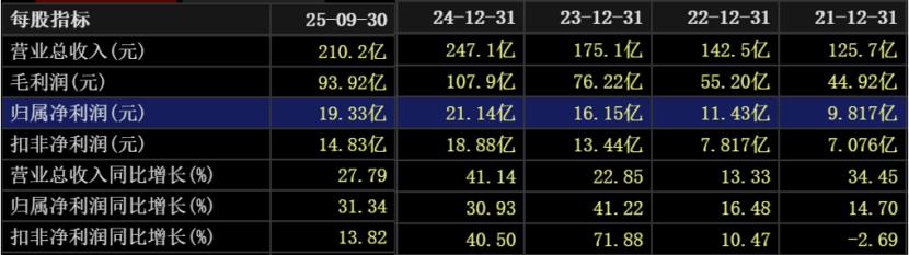 2022年、2023年、2024年及2025年1-9月,公司的收入分别为142.5亿元、175.1亿元、247.1亿元、210.2亿元,分别录得归属净利润11.43亿元、16.15亿元、21.14亿元、19.33亿元。