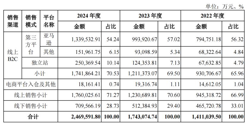 其中,线上B2C平台是公司主要的产品销售渠道。2022年至2024年,公司线上B2C模式销售收入占主营业务收入比重分别为65.96%、69.50%和70.53%。线上销售收入中,亚马逊渠道占比75%以上。