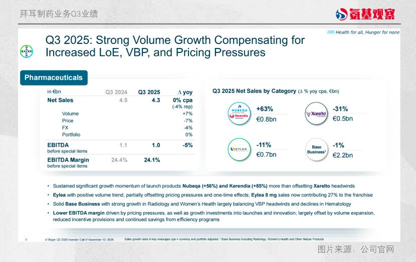 目前看,改革初见成效,得益于新药获批及核心药物销售的增长,拜耳正在重新获得投资者的押注。根据三季报,现有商业化创新药中表现突出的是前列腺癌药物Nubeqa和慢性肾脏病治疗药物Kerendia ,合计增长63%至8亿欧元。这一增长帮助抵消了核心老产品的下滑,其中Xarelto因专利悬崖,销售额下降31%至5亿欧元;Eylea因竞争恶劣,销售额下降11%至7亿欧元。