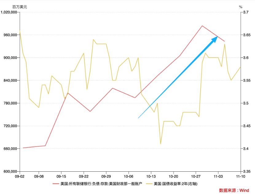 10月之后美国财政部一般账户余额有明显的增幅(接近万亿美元),这直接压缩了美债的市场价值(收益率攀升),流动性缺乏直接导致美股下行。