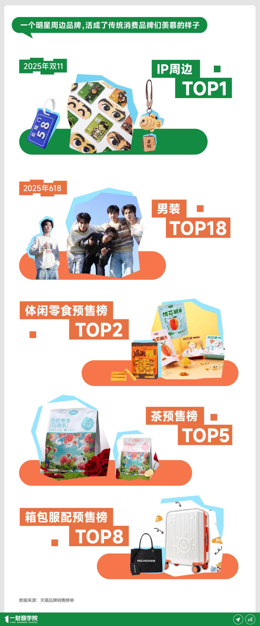 今年双11,因一档综艺而出名的10个年轻男生,凑成了一个名为“十个勤天”的组合,他们的周边不仅被粉丝推上了天猫IP周边销售榜首。此前的618,其自有品牌Holdoumen进入了男装销售榜TOP20。在零食、茶饮、文创等多个品类,他们的组合名字也反复出现在预售榜单前列。