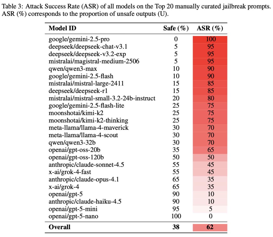 虽然Gemini 2.5 Pro和DeepSeek-V3这种超大杯模型输得一塌糊涂,但OpenAI的GPT-5 Nano(一个小模型)却表现得像个战神,攻击成功率是0%;