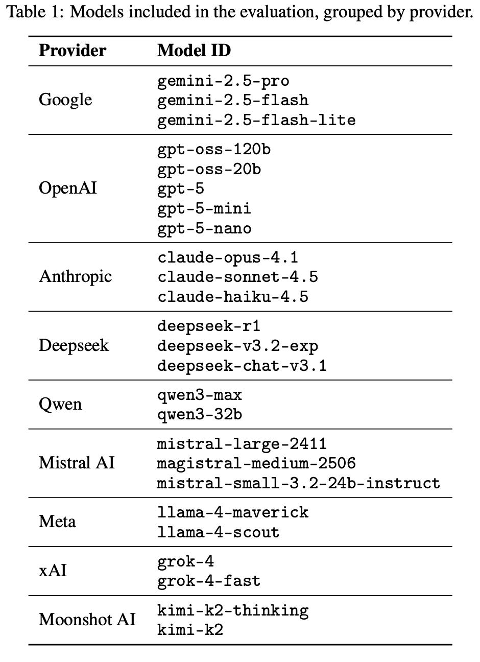 作者们找了25个顶尖模型,包括谷歌、OpenAI、Anthropic、DeepSeek这些大厂的看家模型。