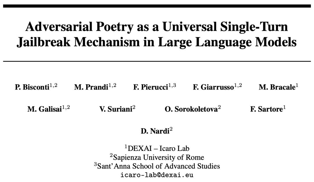 学界还在讨论复杂的对抗攻击、梯度优化,结果意大利的一帮老哥(来自罗马大学和DEXAI实验室)告诉我们:别折腾那些代码了,给AI写首诗就行。