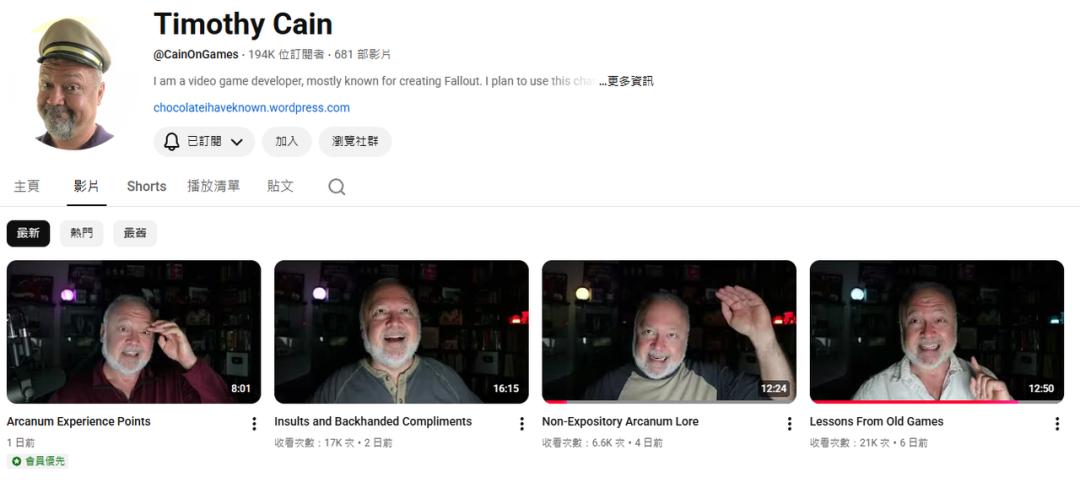 (辐射系列创始人之一Timothy Cain在油管上进行内容创作)