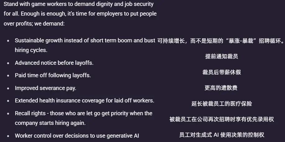 从打工人的角度出发,我也希望在当今这个不安定的时代,更多被压薪、被当做一次性电池消耗的游戏人们,也能像美国游戏从业者一样积极发声,并通过各种合法途径争取自己的权益。