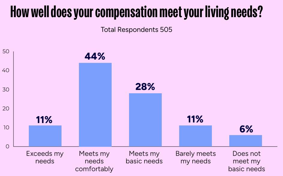 从整体数据来看,美国游戏从业者对“薪资使用”的满意度整体偏高。83%的受访者认为当前薪资能够“基本满足”“较好满足”或“非常满足”日常生活需求,仅17%的从业者表示薪资“勉强够用”或“完全无法满足”。
