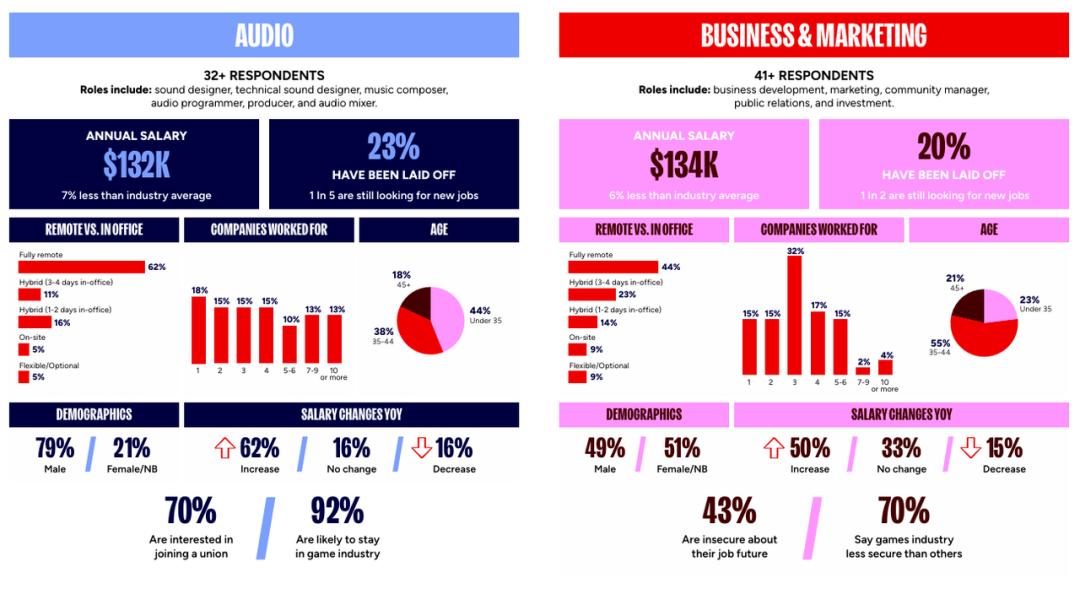 即使找到了工作,从业者们仍面临着裁员风险,一年一家公司,这从来不是笑话——尤其是对于创意领域从业者而言。调查显示,音频、游戏设计或视觉艺术领域工作者中,32%在过去十年内任职过至少五家公司(而编程、商务或运营领域这一比例仅为 13%)。