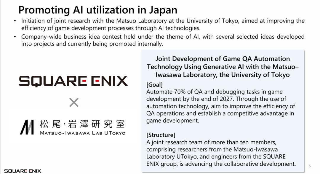 (SE计划到 2027 年末,通过AI将游戏开发中70%的QA与调试任务实现自动化。)