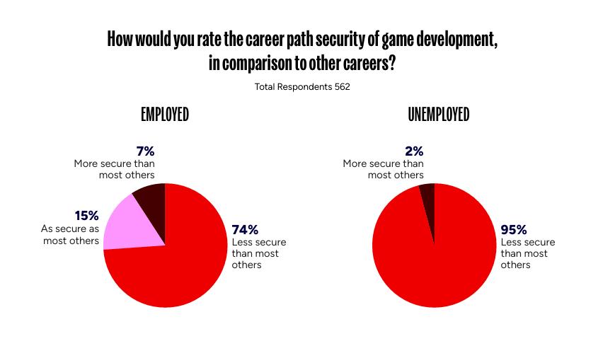 在这样的裁员风潮下,当从业者们被要求对比其他职业评估游戏开发的稳定性时,近74%的在职者认为游戏开发比其他行业更缺乏稳定,这一数字在失业者中则高达95%,总体受访者中有80%认为这是“稳定性低”的行业。