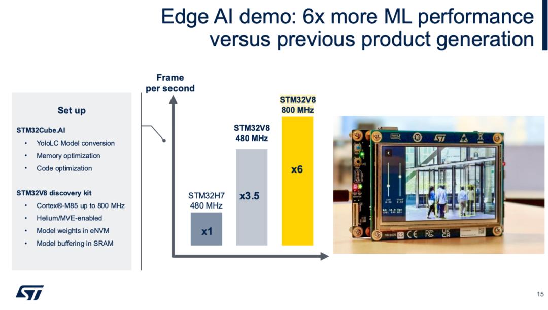 AI能力的大提升是STM32V8的另一个优势。通过Arm Helium M-profile向量扩展(MVE)技术构筑AI能力基石。Helium作为基于打包单指令多数据(SIMD)和单元素标量指令的Arm数学架构,支持整数与浮点数运算,涵盖8位至64位整型操作及128位向量中的16/32位浮点运算。该技术为高性能微控制器带来增强的机器学习(ML)与数字信号处理(DSP)能力,Arm更将MVE封装成适用于C/C++开发的函数库与代码生成工具。