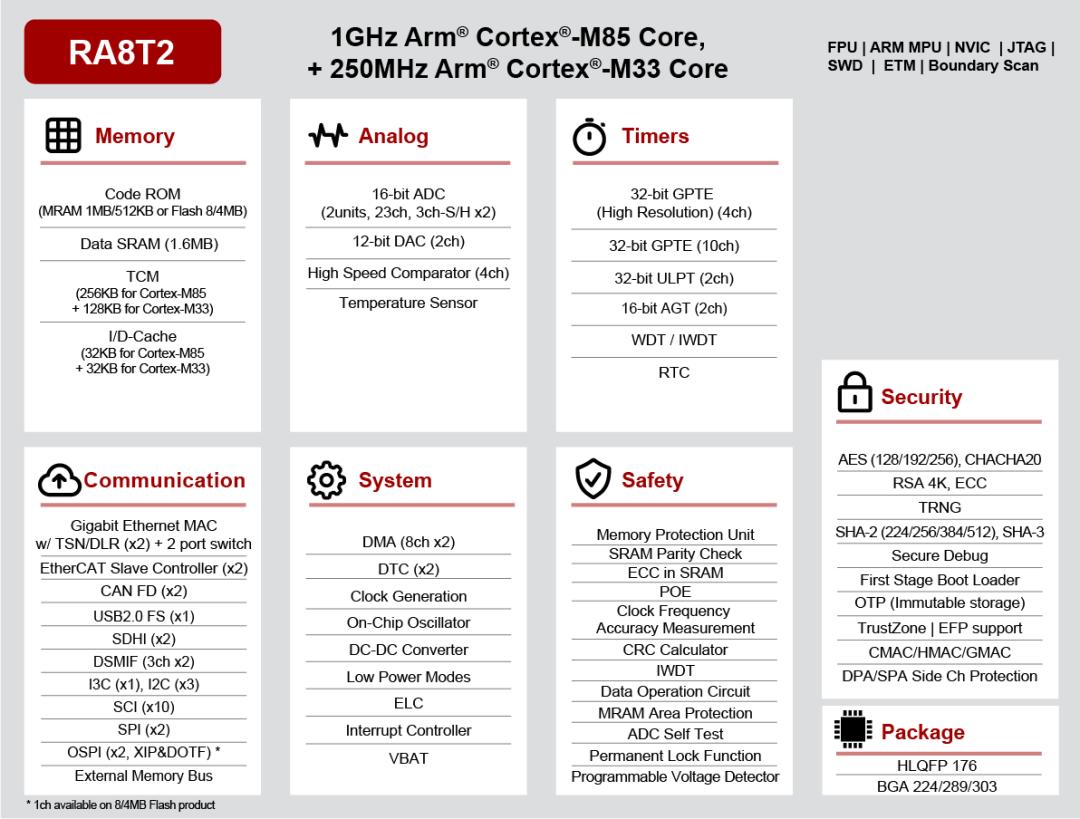 今年10月,瑞萨继续迭代,推出1GHz RA8T2 Cortex-M85微控制器,集成MRAM与EtherCAT赋能工业电机控制微控制器。该产品集成1MB MRAM、2MB带 ECC校验的SRAM,同时为双内核分别配置256KB(M85)和 128KB(M33)紧耦合内存(TCM),并支持SiP封装扩展至8MB外部闪存。