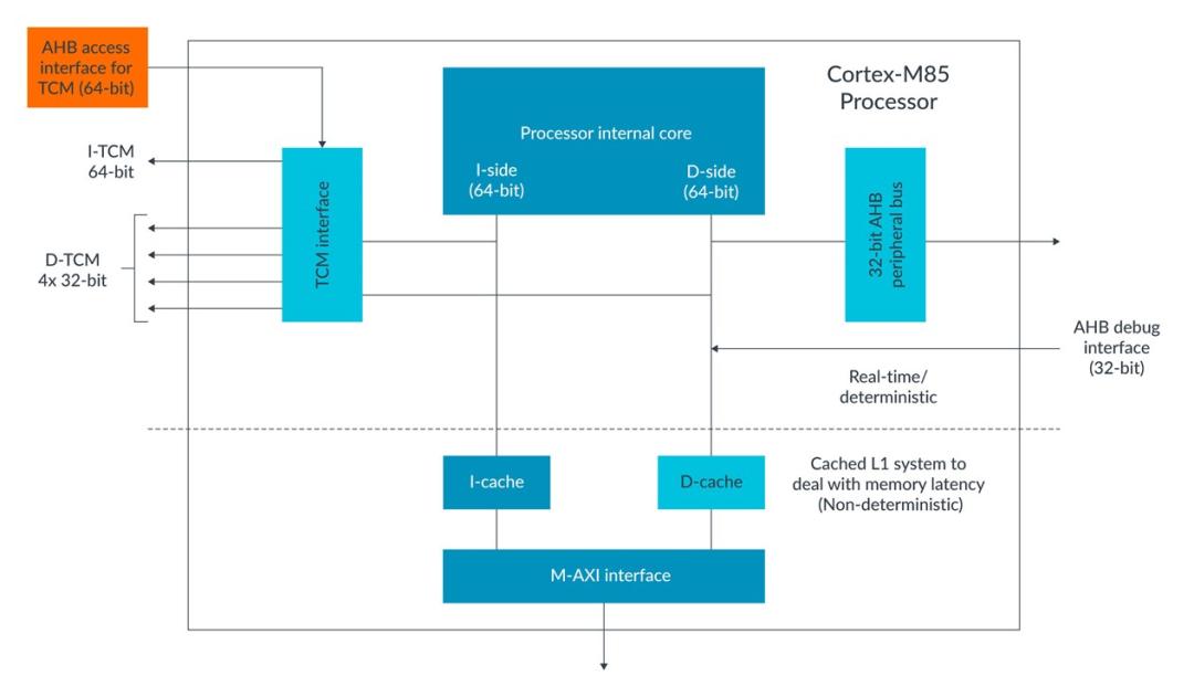 M85配备紧密耦合内存(TCM)的低延迟内存系统可保障确定性操作。该架构为SoC设计人员提供了四个32位数据TCM接口与一个64位指令TCM接口,所有接口均集成错误校正码(ECC)功能。新增的32位AHB访问接口端口允许外部DMA控制器与M85处理器内核并发访问TCM,从而支持多种常见的数据流处理应用场景。