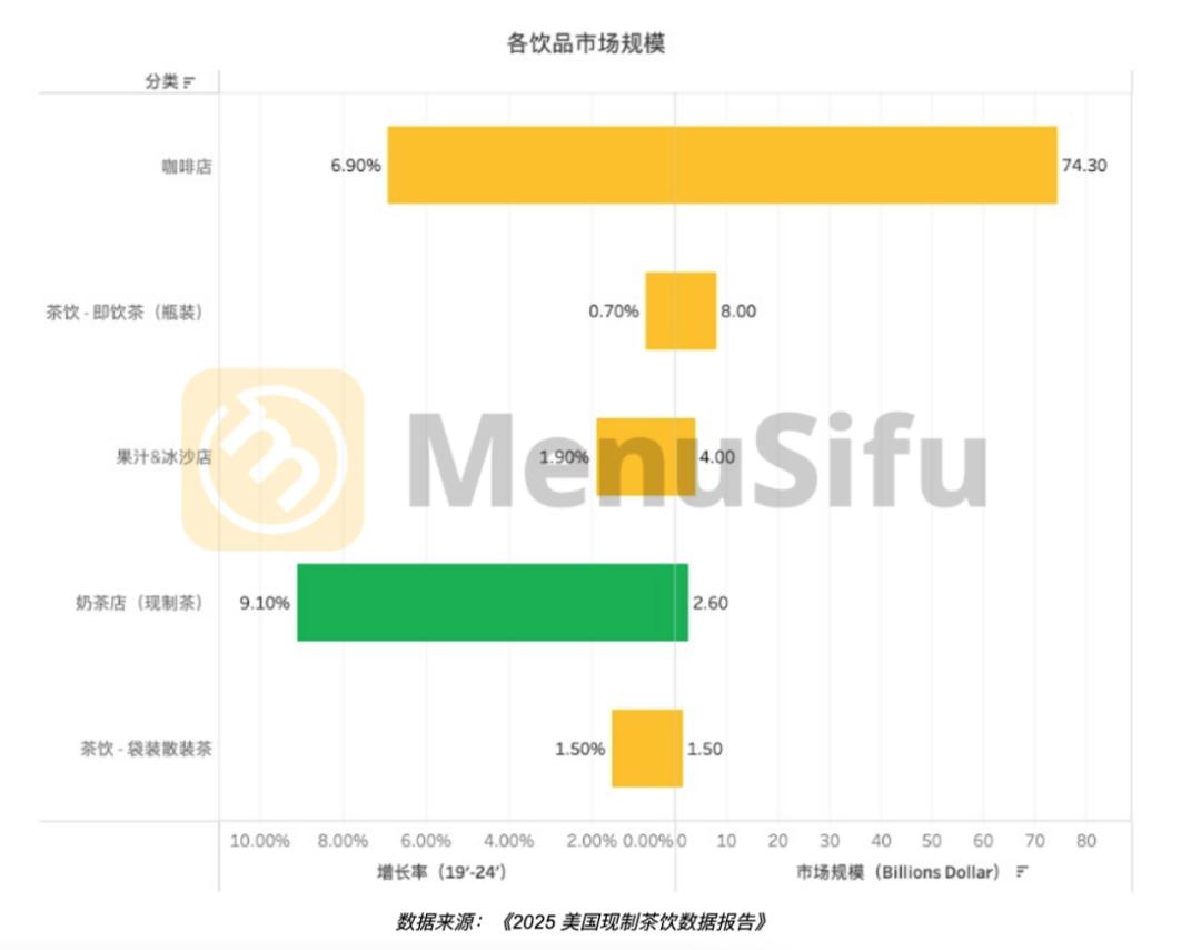 而且美国现制茶饮市场规模为26亿美元,还在以年均9.1%的速度快速增长。