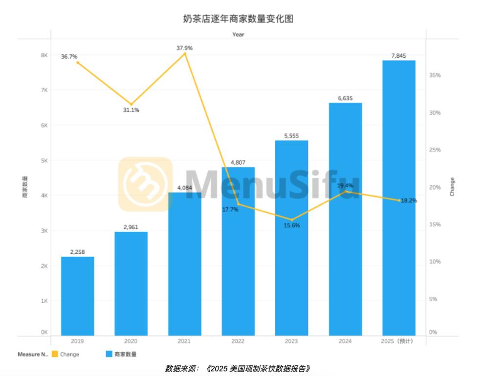 2010年以前,美国人眼中的“茶饮”还仅限于咖啡店里的柠檬茶或泰式奶茶。但随着贡茶、老虎堂等台湾品牌登陆,珍珠奶茶风潮迅速席卷美国。MenuSifu的《2025美国现制茶饮数据报告》显示,近年来随着喜茶、霸王茶姬等中国大陆品牌的加入,美国奶茶店数量激增至2024年的6636家,预计2025年将达7845家。