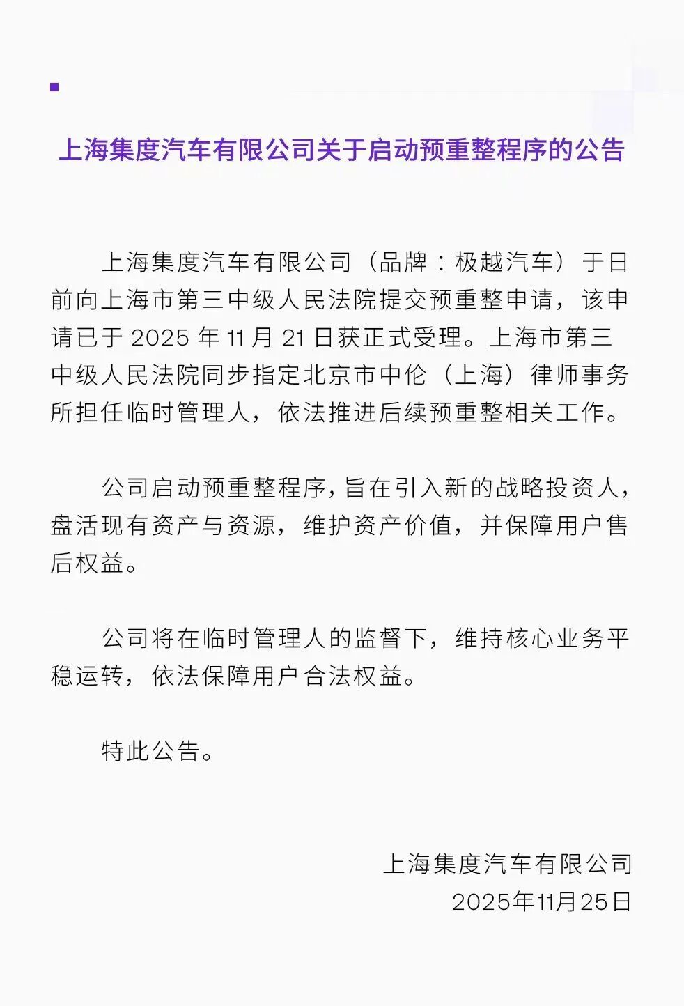 11月25日,极越微信公众号发布了一则预重整公告,宣布其已向上海市第三中级人民法院提交预重整申请,并于 11月21日获正式受理。极越表示:公司启动预重整程序,旨在引入新的战略投资人,盘活现有资产与资源,维护资产价值,并保障用户售后权益。