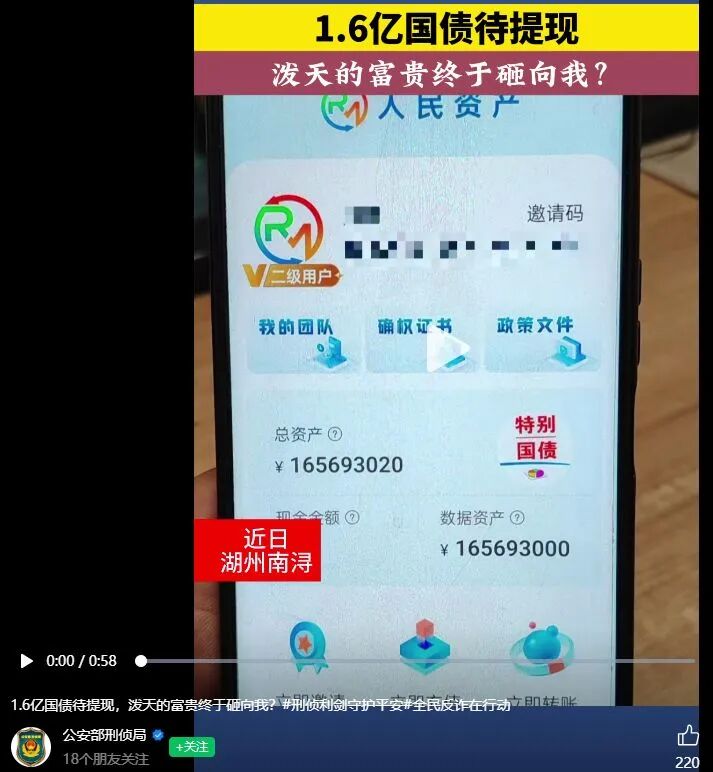 2024年12月,公安部经侦局公布的一起发生在湖州南浔的案件也与此有关。当地城西派出所之前接到的预警指令显示,辖区陈某疑似遭遇电信网络诈骗,具体情况为陈某花了1000元投资所谓的“国债”,视频画面中就出现了“人民资产”App。