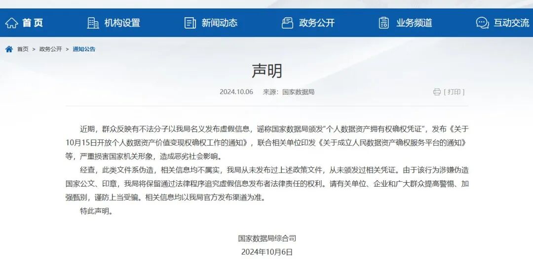 国家数据局2024年10月发布声明称,所谓“个人数据资产拥有权确权凭证”并不存在,不法分子发布的《关于10月15日开放个人数据资产价值变现权确权工作的通知》《关于成立人民数据资产确权服务平台的通知》等,都是伪造文件,该行为涉嫌伪造国家公文、印章。